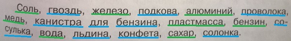 Названия веществ: соль, железо, алюминий, медь, пластмасса, бензин,