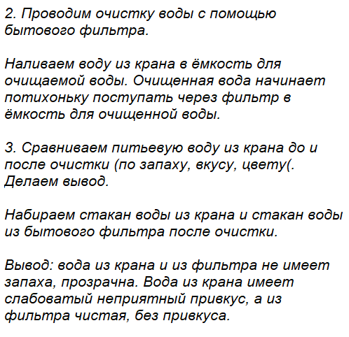 Окружающий мир 3 класс рабочая тетрадь 2 часть страница 18 2) Вырежьте детали из Приложения и постройте модель – аппликацию Пути поступления загрязняющих веществ в организм человека 3) С помощью учебника допишите определение. Экологическая безопасность – это ________________ Ответ: 2. Практическая работа " Учимся пользоваться бытовым фильтром для воды". Цель работы: научиться пользоваться бытовым фильтром для воды. Оборудование: фильтр – кувшин для воды, два стакана (в одном из них – питьевая вода из крана для очистки). Ход работы (по заданиям учебника). 1. Знакомимся с устройством бытового фильтра. 2. Проводим очистку воды с помощью бытового фильтра. 3. Сравниваем питьевую воду из крана до и после очистки (по запаху, вкусу, цвету). Делаем вывод. 1) Нарисуйте детали изученного вами фильтра. 2) Запишите результаты сравнения питьевой воды до и после очистки. Вода до очистки: ____________________________________ . Вода после очистки: _________________________________ . Вывод: ____________________________________________ . Оценка выполненной работы (достигнута ли цель): Презентация: сообщите классу о результатах работы, выслушайте и оцените другие сообщения. Ответ: